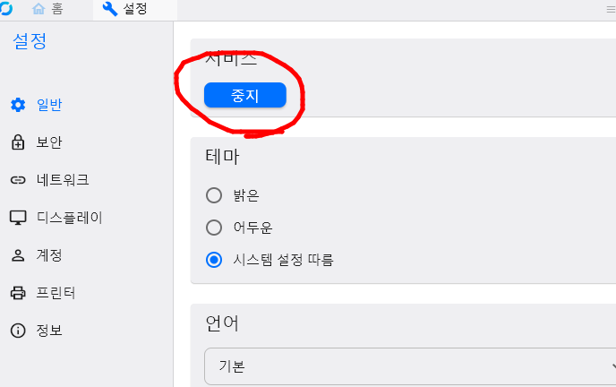 중지 버튼이 떠있나 확인 안 떠있으면, 시작 클릭